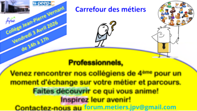Les associations de parents d'élèves du collège vous invitent à participer au carrefour des métiers! Toutes les informations sont disponibles sur le flyer en pièce jointe.